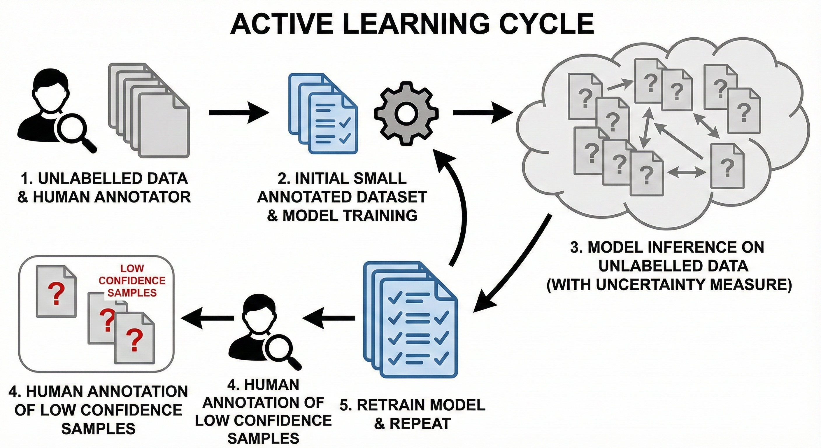 - Whichever samples have low confidence level, for them, ask the human annotator to label them.