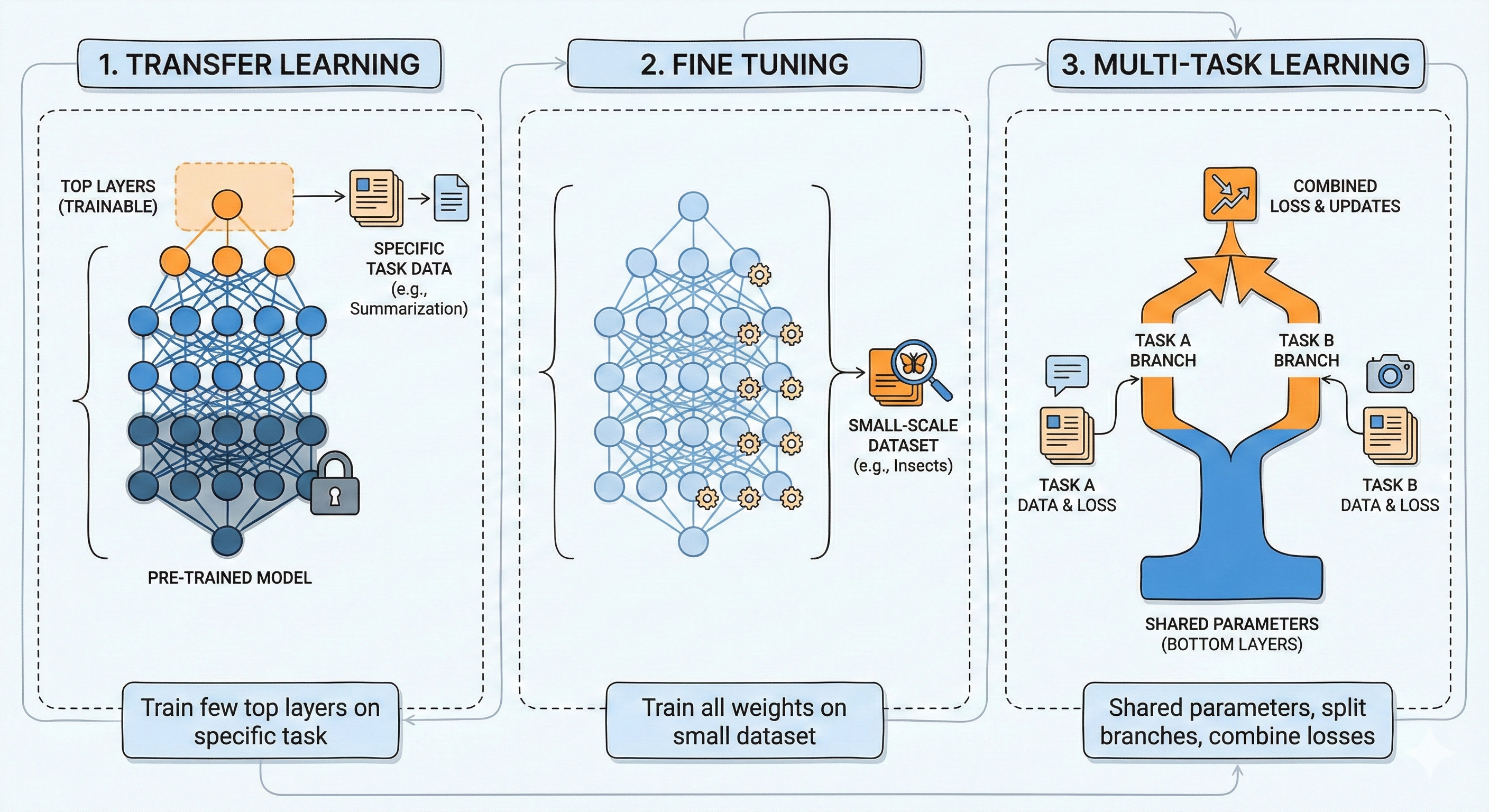 Multi-task Learning: Here, we take atleast two different tasks, and we want to keep the idea of shared parameters like transfer learning. But, instead of training for one task at a time, we combine the losses arising from two different tasks, and then train the entire network (like fine tuning). The network architecture looks like it has a few shared parameter at the bottom layers, but suddenly it splits off into branches, each adapted to a specific task, and uses different parameters and different set of top layers.